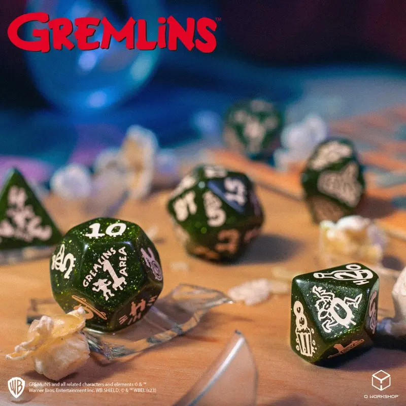 This set looks like it snuck out of a midnight snack raid and rolled straight onto your table. Six shimmering green dice feature the unruly Gremlins themselves, while the seventh—an adorable shimmering copper D6—carries Gizmo, the only responsible one of the bunch. The nude engravings and dripping digit style give the whole set a fun, retro-’80s personality. Perfect for players who like their sessions a little wild, a little nostalgic, and occasionally one rule away from catastrophe.