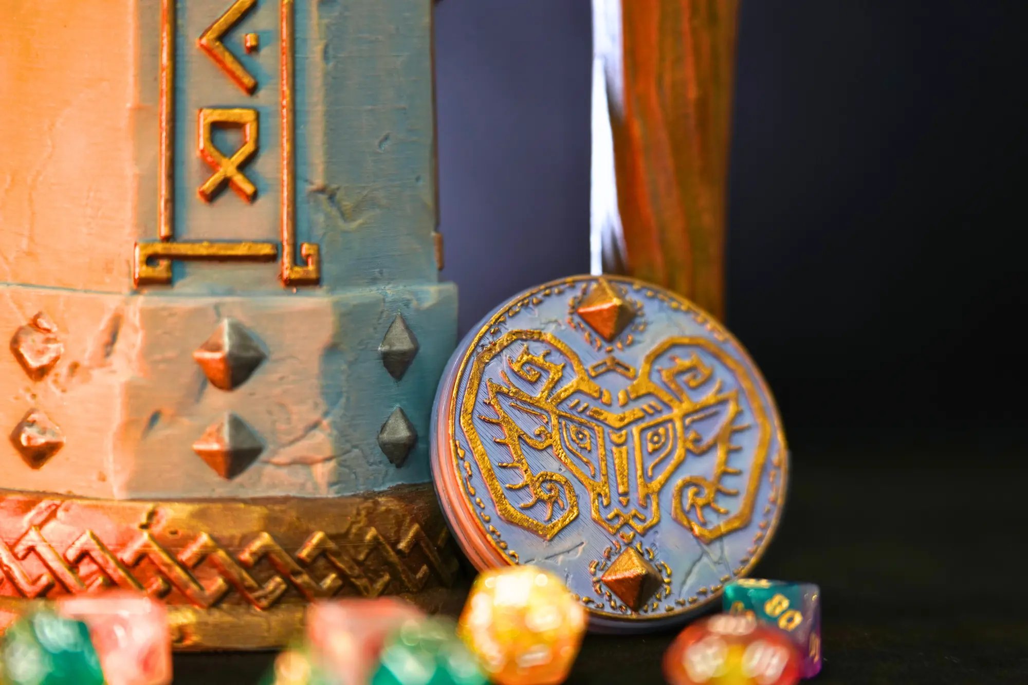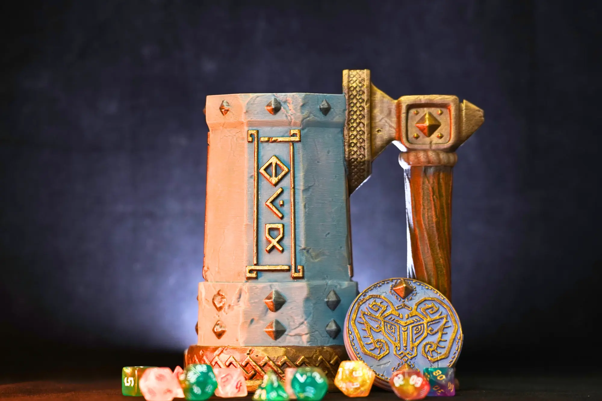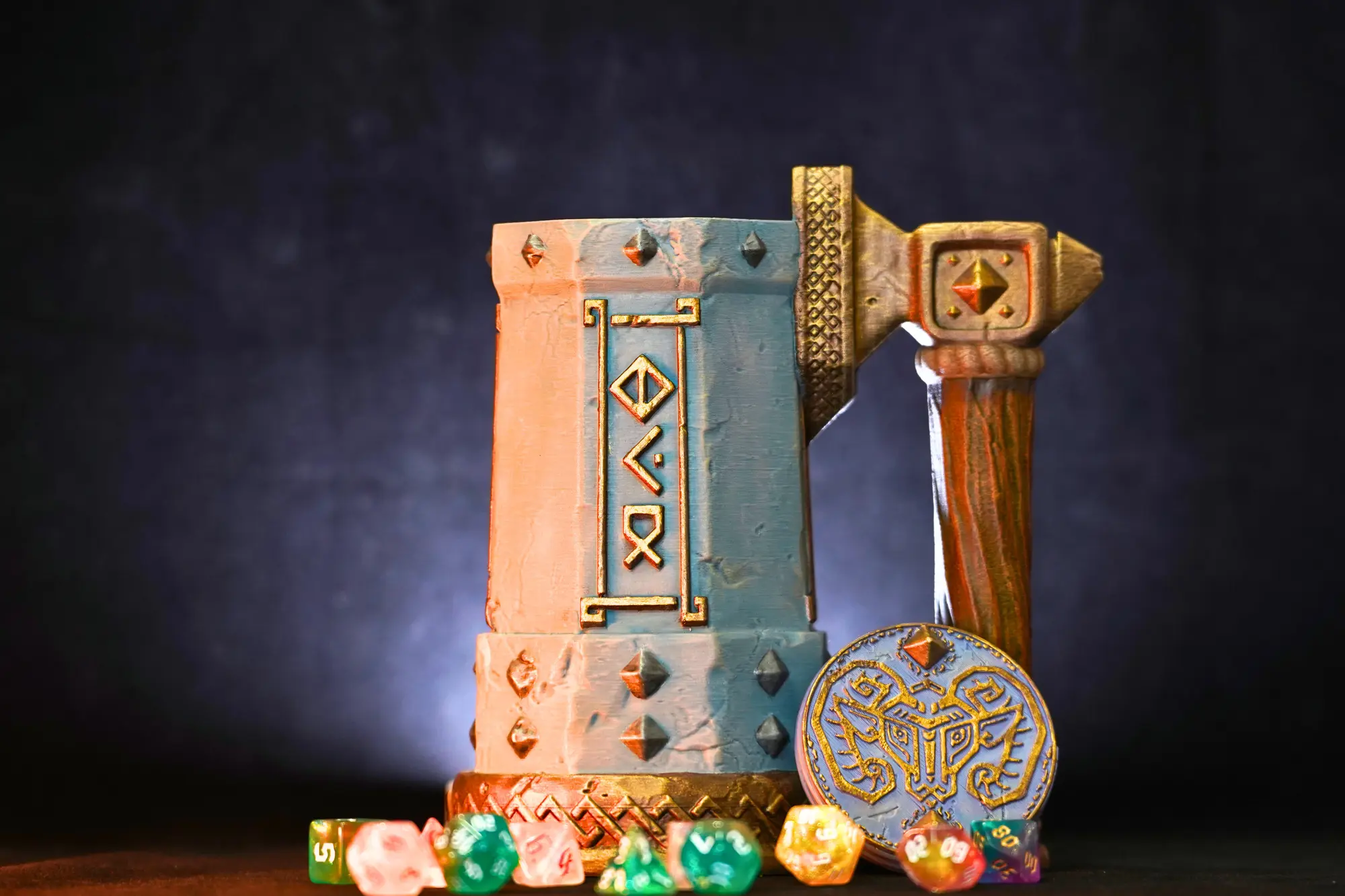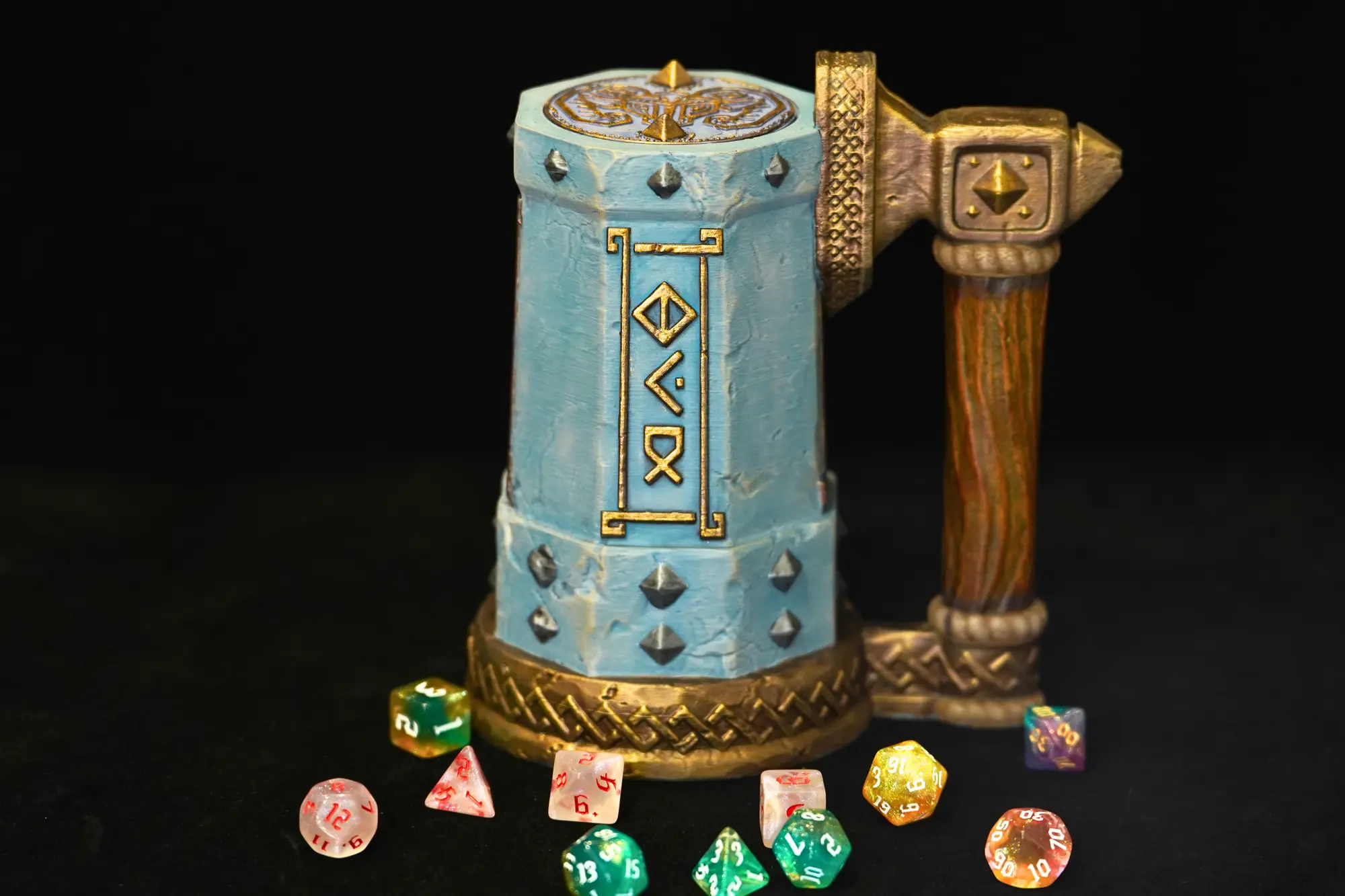 The Dwarf Dice Mug is built for players who enjoy solid craftsmanship, stonework themes, and a bit of classic dwarven character at the table. It functions as both a dice container and a can holder for drink cans up to 500ml, with included risers that fit 330ml and 440ml sizes. A dependable accessory for fans of Dungeons & Dragons, Pathfinder, and other fantasy RPGs who appreciate rugged, runic-inspired gear.